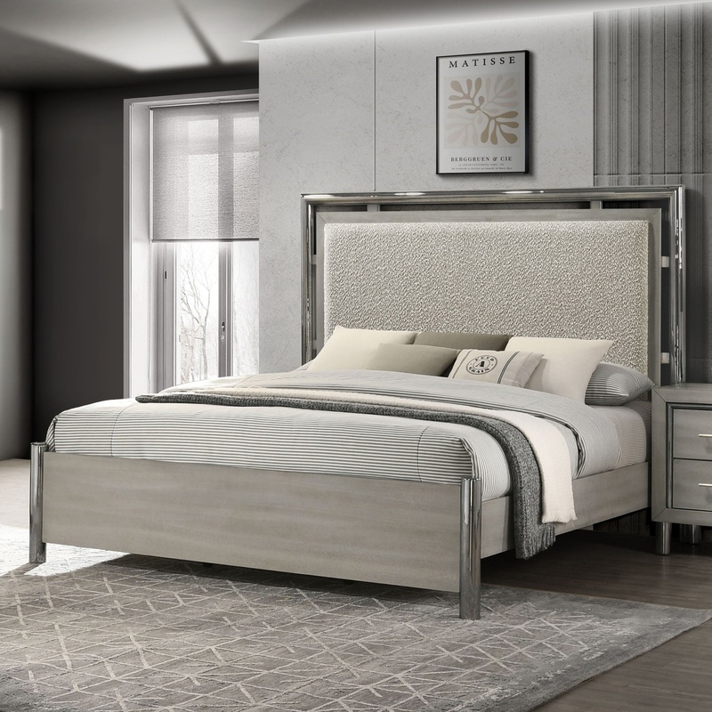 The Lennox Upholstered Panel Bed combines modern elegance, exceptional durability, and ultimate comfort to create the perfect centerpiece for your bedroom. This bed includes a headboard, footboard, slat kit, and two side rails, all expertly crafted from premium engineered woods and finished with an eco-friendly gray ash laminate. Its sleek, contemporary design is further elevated by lustrous metallic details that mimic the polished look of stainless steel while offering scratch resistance and lasting durability. The generously padded headboard, upholstered in distinctive boucle fabric, provides a cozy and supportive spot ideal for lounging or enjoying a good book, making the Lennox Bed a harmonious blend of style, functionality, and comfort.