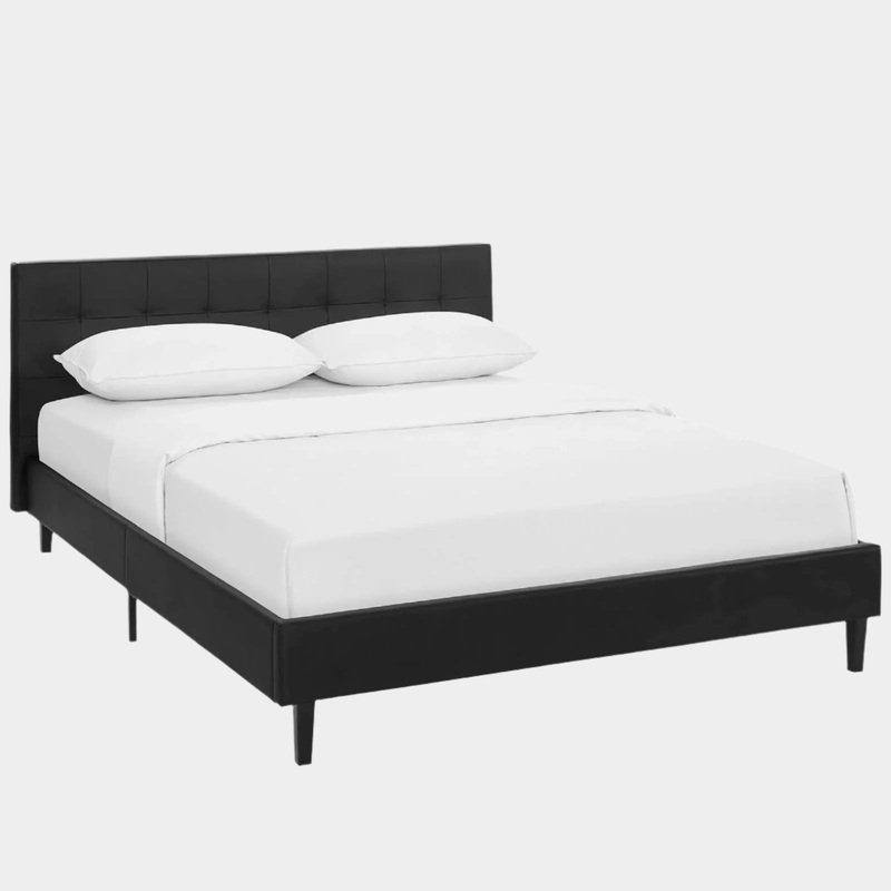 Inspire sweet dreams with the Linnea Platform Bed. Charmingly designed with grace and distinction, Linnea comes with a padded vinyl base, tufted vinyl headboard, solid wood legs, and a slatted wood support system that eliminates the need for a box spring. Complete with a reinforced center beam with supporting legs for maximal stability, Linnea accommodates the various mattress types on the market such as memory foam, spring, latex, and hybrid. Imparting a heartening chic-luxe look, Linnea is a well-made bed perfect for the instant update or bedroom transformation. Weight capacity up to 1300 lbs. Mattress Not Included.
