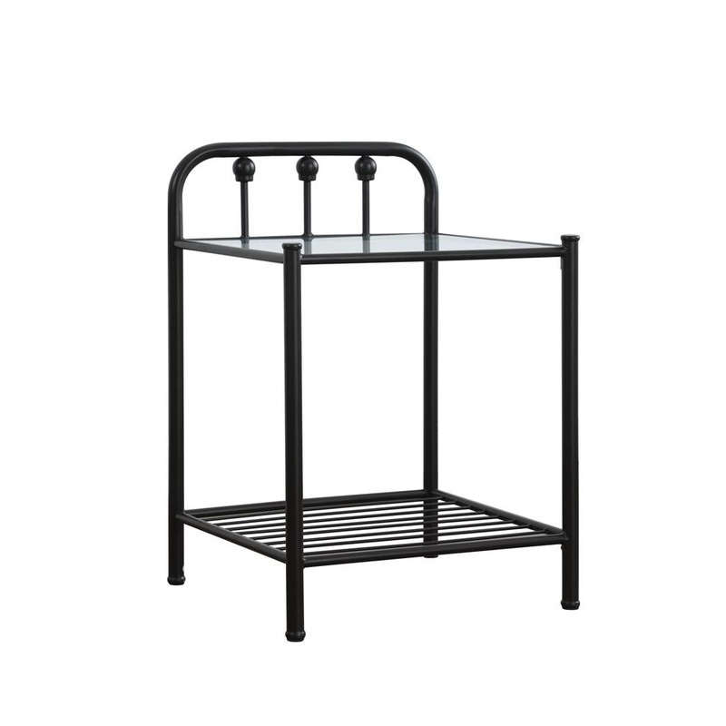 This metal nightstand brings farmhouse charm and functional design to your bedside. Crafted with a dark bronze powder-coated frame, it features a clear tempered glass top for open visibility and easy cleaning. A lower slatted metal shelf adds extra storage