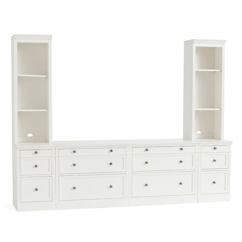 Classic details like crown molding, fluted posts and hand-applied finishes give the customizable Livingston Collection timeless appeal. This bookcase rests on a plinth base and comes with a cabinet in the style of your choice plus wire cutouts on the towers to accommodate electronics. Designed to work seamlessly with the other modular components, it creates a work space that is both functional and sophisticated.Made of kiln-dried solid meranti wood and veneers.Finishes are hand applied in multiple layers.Gray wash is accentuated with dark pewter hardware; brown wash with antique bronze hardware, dusty charcoal with dark pewter hardware and Montauk white with antique nickel hardware.Modular units can be secured together using supplied hardware to provide the look and feel of custom cabinetry.Features artisan-crafted details such as solid wood drawer boxes crafted with English dovetail joinery and smooth ball bearing glides.Bookcase Hutches are detailed with cord management.File Cabinets have 2 drawers that hold legal- or letter-sized files and are equipped with heavy-duty side-mounted glides. File glides can also be removed for regular drawer storage.Anti-tilt guard prevents both drawers on the File Cabinets from being pulled out at the same time.Includes (2) 17.5″ 2-Drawer File Cabinets, (2) 35″ 2-Drawer File Cabinets, (1) 70″ Top, (2) 17.5″ Tops and (2) 17.5″ Bookcase Hutches.Cabinets includes levelers for stability on uneven surfaces.Anti-tip kit included: comes with safety-tested mounting hardware, instructions and a nylon strap. To prevent injuries from furniture tip-over, this item should be securely fixed to the wall. how to install anti-tip kits.Imported.
