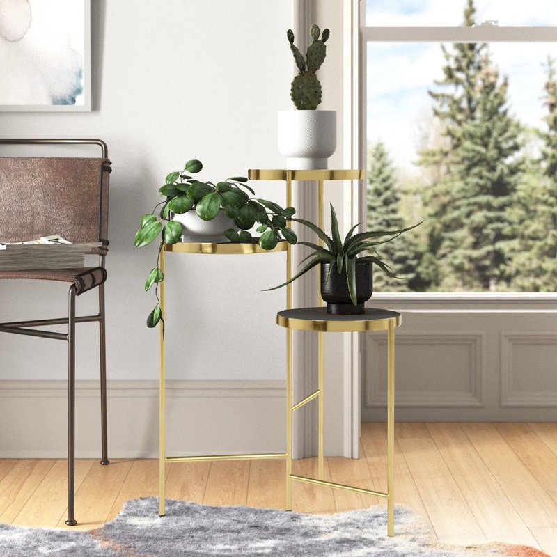 This multi-tiered plant stand brings a sleek, modern look anywhere in your home. It has a thin metal frame that rests on four slender legs, one of them in the middle and three on the outer sections. Horizontal bars connect them all to provide plenty of sup
