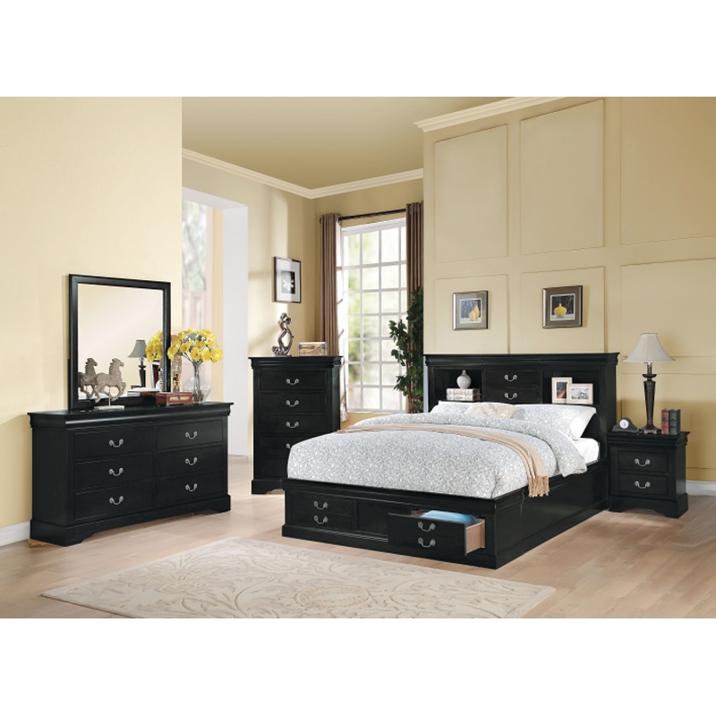 ACME Louis Philippe III Eastern King Bed w/Storage, Black (1Set/3Ctn), 82" x 77" x 48"H, 198lbs. The Louis Philippe III storage bedroom collection features storage bed, headboard with hidden drawers, carefully crafted with selected wood and veneers and com