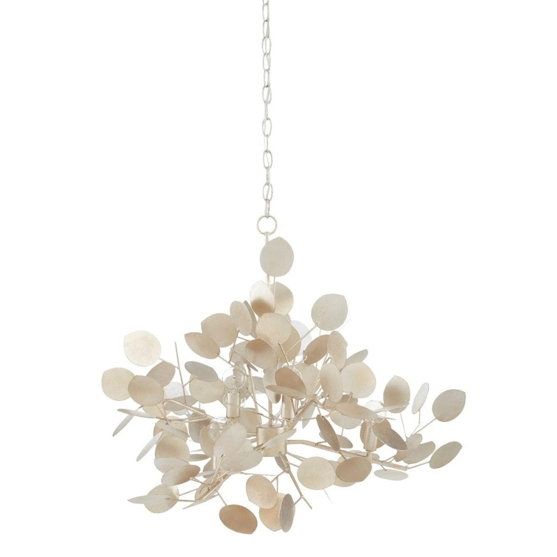 With a lyrical profile of fluttering discs that favor the leaves of its namesake plant, the Lunaria Small Chandelier is made of wrought iron in a contemporary silver leaf finish. The bulbs that are sprinkled amongst the flowing petals of metal reflect off