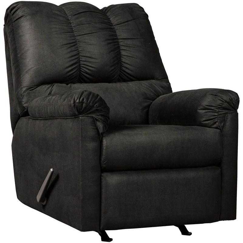 The Marcy rocker recliner is an obvious match for the rest of the Marcy collectionbut its versatility goes even further. Comfort and transitional style are its strong points, with a plumply cushioned headrest and arms, one-pull reclining mechanism, and gen