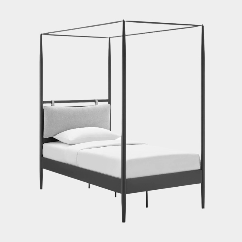 Sculptural and serene, the Marlowe Queen Canopy Bed brings architectural elegance to the modern bedroom. A contemporary interpretation of a classic four-poster frame, this queen-size platform bed is crafted from durable iron metal with gently tapered posts that create an airy yet grounded silhouette. The minimalist frame is softened by an integrated cushioned headboardtwo plush, upholstered pillows attached with fabric straps. These headrests can be adjusted up or down for personalized comfort or removed entirely for a streamlined look. Designed to support a variety of mattress types, this canopy bed with integrated headboard includes a poplar wood mattress foundation that promotes airflow and eliminates the need for a box spring. With its blend of comfort, structure, and versatility, this canopy bed redefines your sleep space with understated drama. Assembly required. Weight Capacity: 800 lbs.