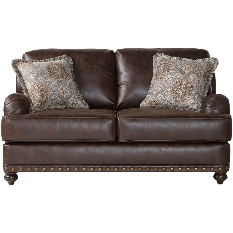 Traditional English arm library style with antique gold nail head accents in a rich brown leather look fabric. Pairs nicely with the matching chair and sofa. Made in the USA, and manufactured with quality in mind. Using only hardwood frames, CertiPUR foam