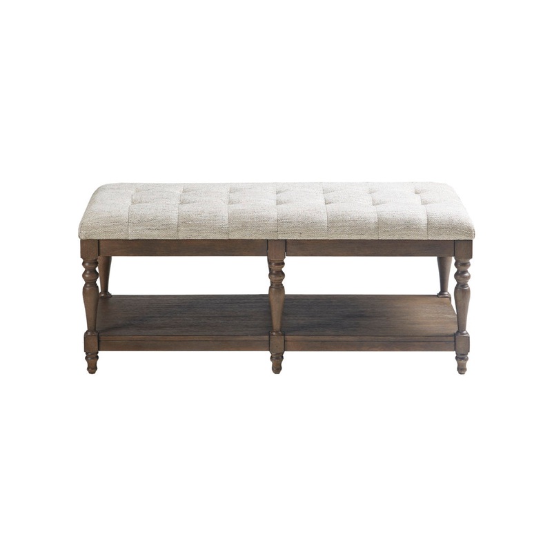 The Martha Stewart Highland tufted accent bench with a shelf offers a sophisticated update to your home decor. This accent bench features a tufted upholstered seat that contrasts beautifully with the wood finish, for an elegant look. The turned wood legs e