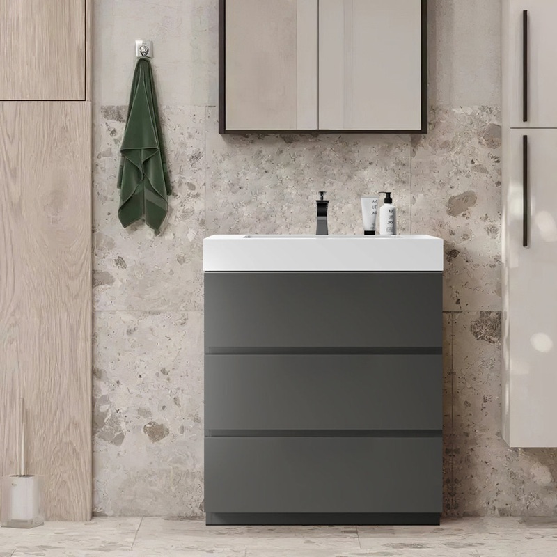 To round out your remodel or easily update your space, there's no better piece than a freestanding vanity like this one. The bathroom vanity is designed with a handleless door. With glossy white engineered stone basins, it exudes a timeless charm that effo