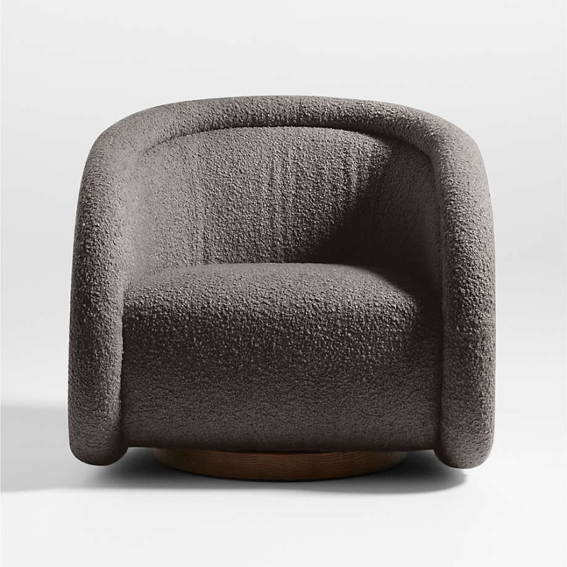 Sophisticated and current, our update to the barrel chair surrounds with comforting curves. Our take on this timeless style accentuates the rounded silhouette with padded channeling that flows in one continuous curve from arm to back to base and back again. Upholstered in a textured boucle in charcoal grey, the tight-cushioned chair offers a substantial seat and low-profile, wrap-around back. The recessed swivel base provides a peek of wood grain finished in light barley brown. Alone or as a pair, our exclusive Medoc swivel chair puts a modern spin on a classic design.By choosing FSC-certified furniture, you are supporting responsible management of the world’s forests.Medoc Swivel Chair 31″Wx31″Dx28″HFSC-certified hardwood and pineBarley finish on wood basePoly-acrylic fabricPolyfoam cushioningSinuous wire suspension360 swivel mechanismFeatures FSC-certified wood from forests that are responsibly managed to be environmentally sound and socially beneficialMade in MexicoSee product label or call customer service for additional details on product content