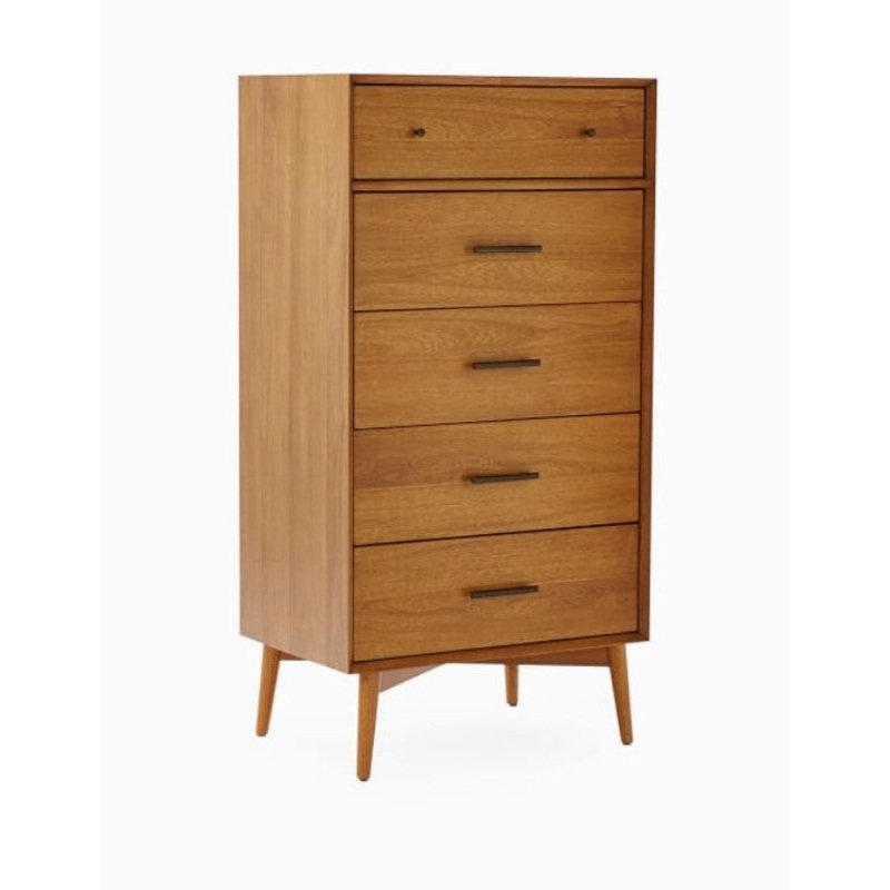 Kiln-dried solid eucalyptus wood frame and legs.Engineered wood sides covered in an acacia wood veneer.Covered in a water-based Acorn finish.Metal hardware in a Dark Brass finish.Five drawers open on solid wood glides.Anti-tip kit hardware (included) is highly recommended to provide protection against tipping of furniture.All wood is FSC-certified. Your purchase of this product helps support forests and ecosystems worldwide. Learn more.GREENGUARD Gold Certified. Meets or exceeds stringent chemical and VOC emissions standards.Made in a Fair Trade Certified facility.Learn more about the positive impact your purchase has on Fair Trade workers and their communities.Made in Vietnam.