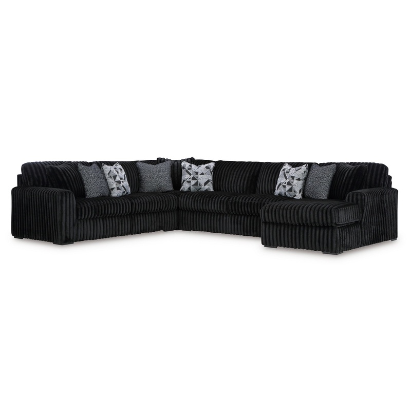 The Midnight Madness 4 Piece Sectional with Right Chaise provides generous seating and laid-back charm. It includes a corner wedge, armless chair, and accent pillows, all in plush corduroy upholstery. Its supportive platform foundation resists sagging and