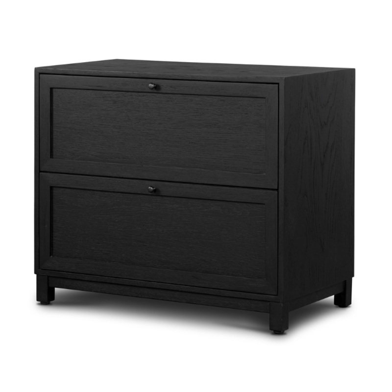 A black-finishes oak veneer nightstand brings storage space to the bedside with two roomy drawers.Overall Dimensions: 32.00"w x 17.00"d x 26.50"hColors: Drifted Matte Black Veneer, Drifted Matte Black Rubberwood, Antique Pewter, Drifted OakMaterials: Oak V