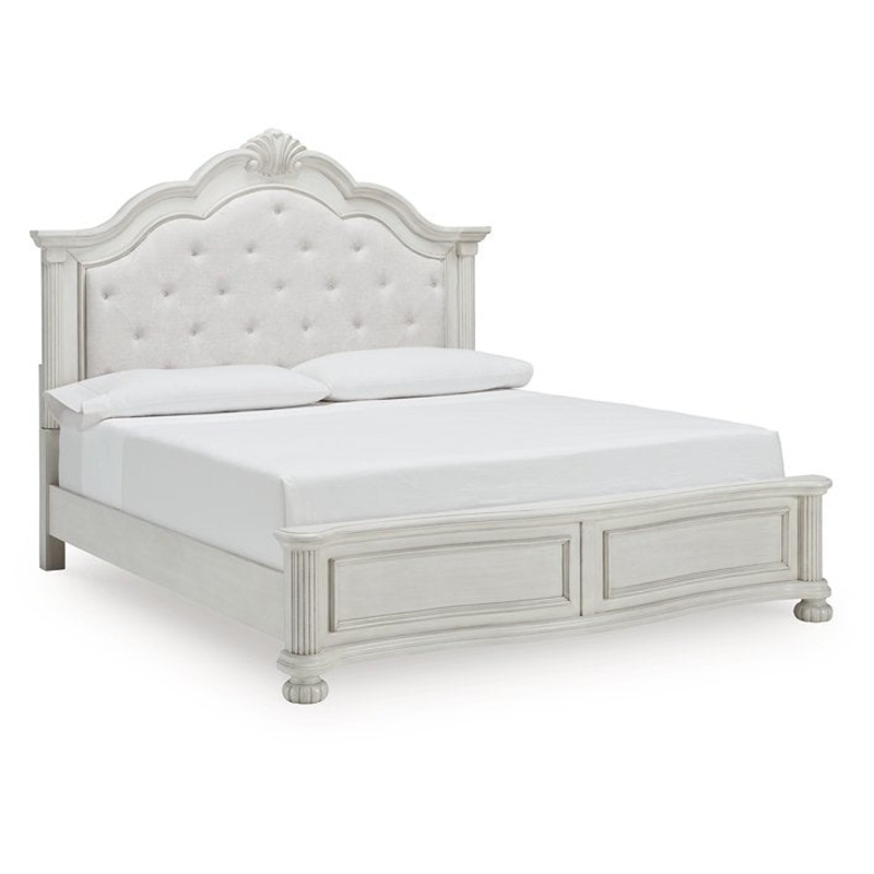 Transform your inner sanctum into a haven of timeless elegance. This traditionally inspired queen upholstered panel bed features a cushioned headboard embellished with a serpentine-shaped crown and light pearl gray upholstery. A contoured footboard with picture frame moulding completes the ageless aesthetic. And did we mention the classic antiqued white finish and stylish reeded bun feet? Talk about relaxed refinement.