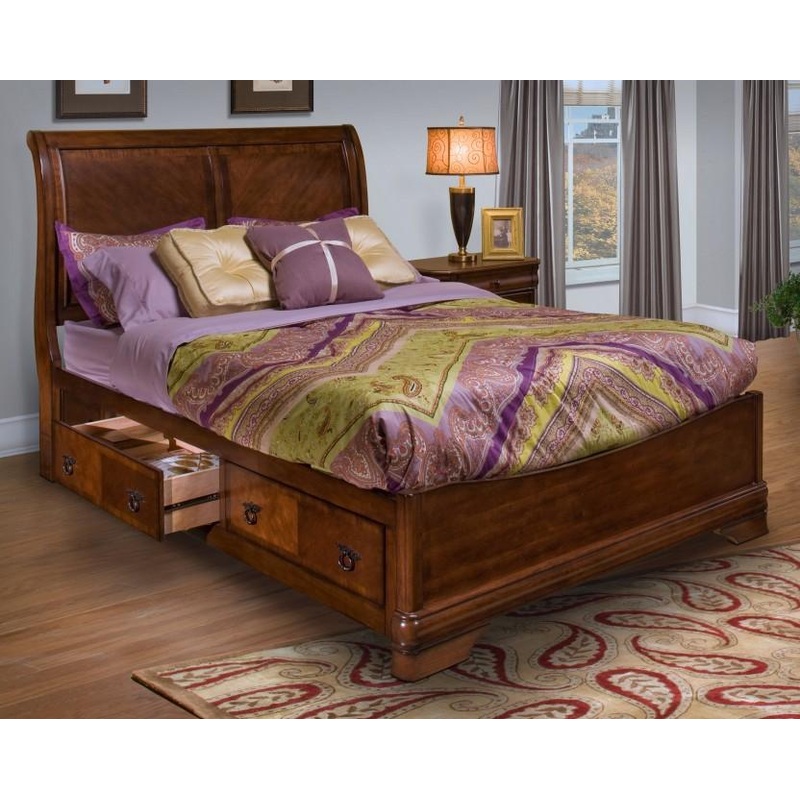 Burnished Cherry Finish Poplar Solids and Birch Veneers Includes Headboard, Footboard Rails and Slats with Hook Rail and 4 Support Slats with 1 Center Leg Storage Rails & Slats with 4 Drawers and 13 Slats Sheridan Collection Also available in Queen and Eas