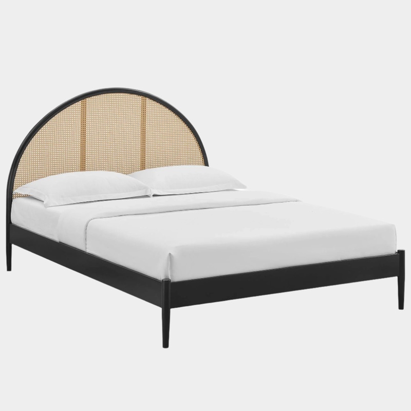 The Odette Queen Platform Bed combines timeless design with modern functionality. Featuring a gently arched rattan cane headboard framed in solid wood, this bed brings warmth and bohemian elegance to any bedroom. Its platform bed frame design with sturdy wood slats eliminates the need for a box spring while offering exceptional mattress support for various types of mattresses. The tapered round legs of this queen bed frame, complete with non-marking floor glides, and center support legs ensure stability and durability. Perfect for boho, farmhouse, and contemporary interiors, the Odette Queen Size Bed is both an aesthetic statement and a functional centerpiece. Assembly required. Weight Capacity: 800 lbs.