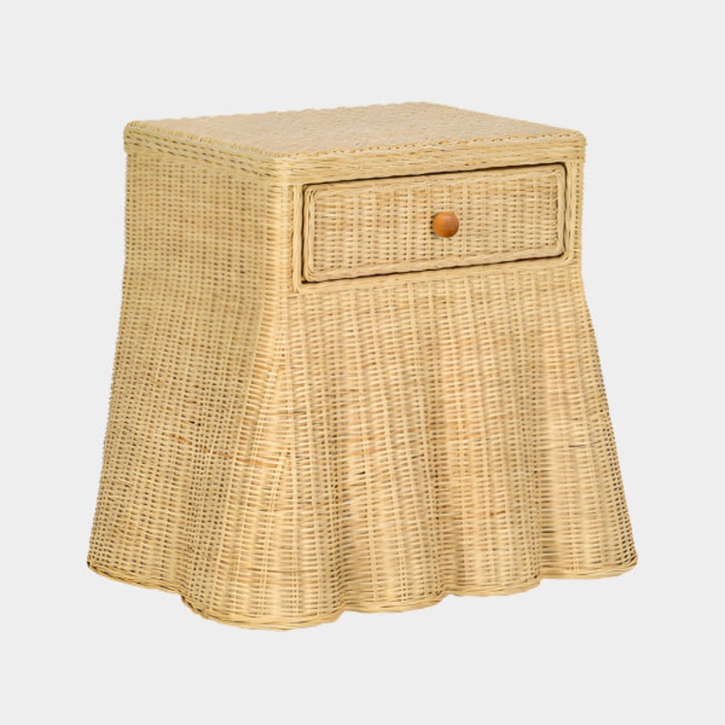 The Pentra Nightstand charms with a handwoven rattan frame, solid wood knob, and a softly skirted base. With a felt-lined drawer and smooth glide rails, it's a dreamy blend of cottage-core whimsy and everyday function.Features:Felt-lined drawer to keep you
