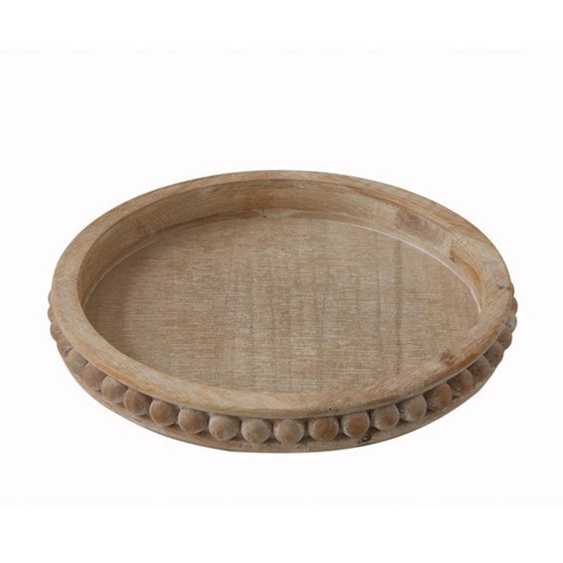 Wooden spheres line the outside of this versatile tray. Perfect for using as a rustic accent to a bar cart or for setting drinks on an upholstered ottoman, this tray is a great way to add a boho touch to any space.