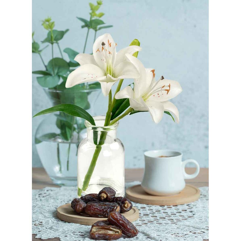This graceful white lily made from PU (Poly) Synthetic Leather comes arranged in a clear glass bottle vase and features faux water for added realism. Simple yet elegant style featuring 1 stem and 2 blooms in a glass vase. This set is perfect for styling office tables, console tables, and windows. Add sheer elegance and class to your space with this delicate faux flower set. Great decorations for home, office, restaurants, weddings, and parties. White lily represents harmoniousness, elegance, great love, and purity, and it is the best gift to someone you love. Sold as a set of 2, the product (incl. vase and flower) is 10″ Tall, whereas the bottle vase alone measures 2.5″ Diameter & 4″ Tall. The diameter of the opening of the bottle is 1.25 inches. You can count on quality, design, and manufacturing when you order from Primrue products, where we curate everything with love.FeaturesMATERIAL – This graceful white lily made from PU (Poly) Synthetic Leather comes arranged in a clear glass bottle vase and features faux water for added realism.MINIMALIST LOOK – Simple yet elegant style featuring 1 stem and 2 blooms in a glass vase. This set is perfect for styling office tables, console tables, and windows.VERSATILE – Add sheer elegance and class to your space with this delicate faux flower set. Great decorations for home, office, restaurants, weddings, and parties.MEANINGFUL GIFT – White lily represents harmoniousness, elegance, great love, and purity, and it is the best gift to someone you love.PERFECT SIZE – Sold as a set of 2, the product (incl. vase and flower) is 10″ Tall, whereas the bottle vase alone measures 2.5″ Diameter & 4″ Tall. The diameter of the opening of the bottle is 1.25 inches. You can count on quality, design, and manufacturing when you order from Primrue products, where we curate everything with love.