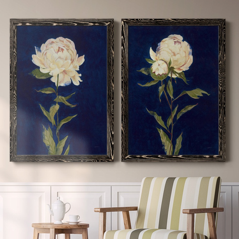 Elevate your space with this 2-piece set of refined wall art. Delivering traditional style with a soft, relaxed vibe, this set of paintings features a pair of cream-colored peonies set on a deep blue background, rendered in a breezy fashion with details ou
