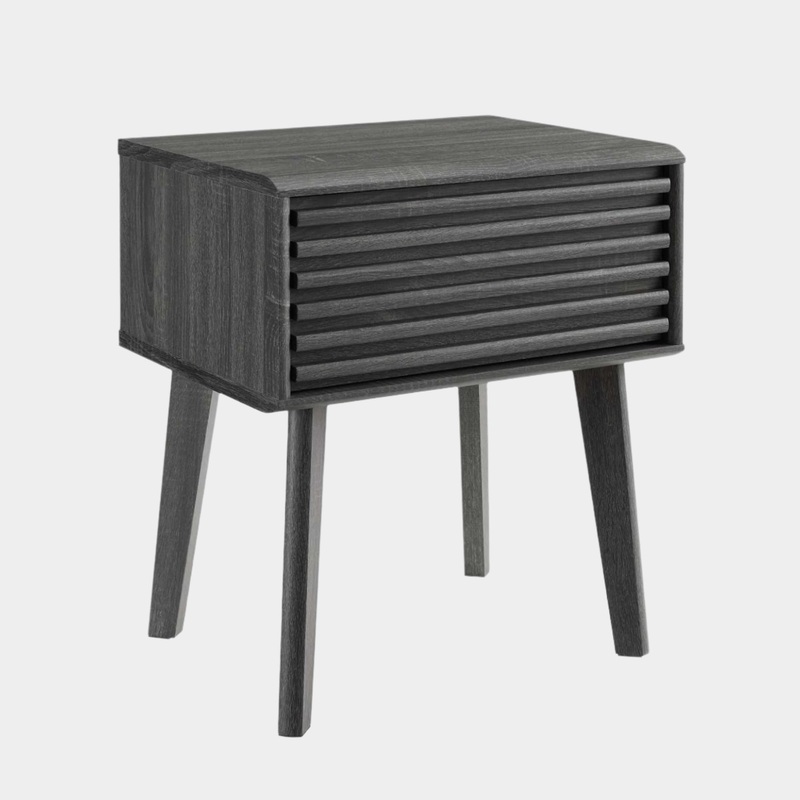 Tap into mid-century aesthetics with the Render End Table Nightstand. This bedside or living room side table features a durable particleboard frame with smooth walnut grain laminate, four tapered wood legs, and full-extension glide storage drawer. Boasting
