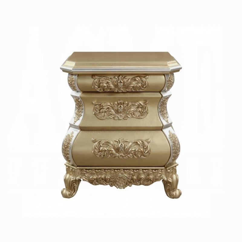 Intricately hollow carved design with romantic scrolling accent highlights this extraordinary style. The Seville Bedroom Collection creates opulence and drama in your room with the dazzling gold hue that enhances its detailed extravagance. Button tufted he
