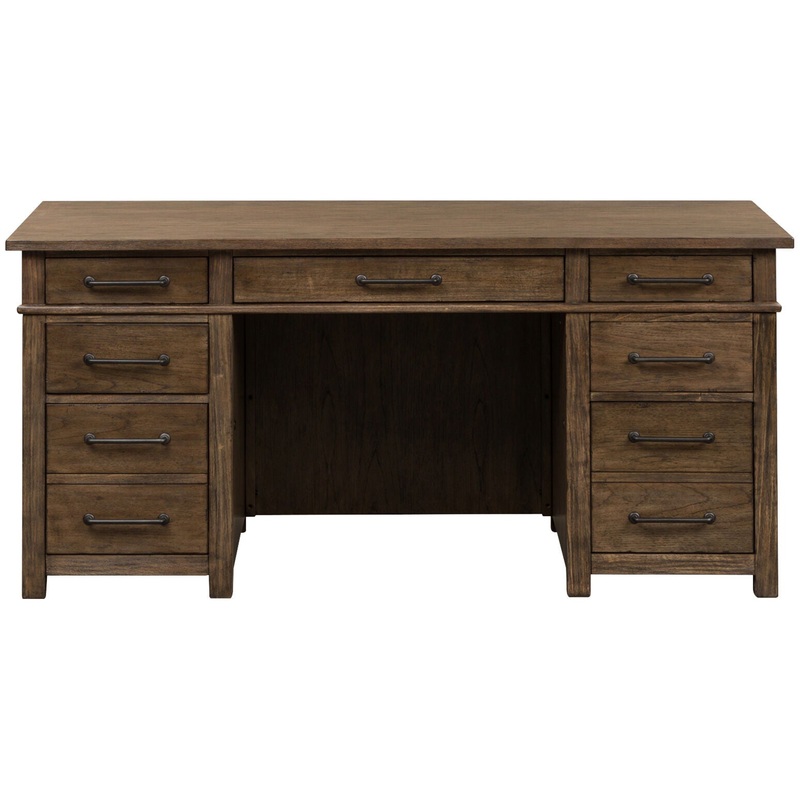 Create a workstation that inspires you to roll up your sleeves and breeze through your tasks! Constructed of poplar solids and cathedral hickory veneers, this desk boasts a timeless designand plenty of practical storage space, too. A flip-down keyboard tra