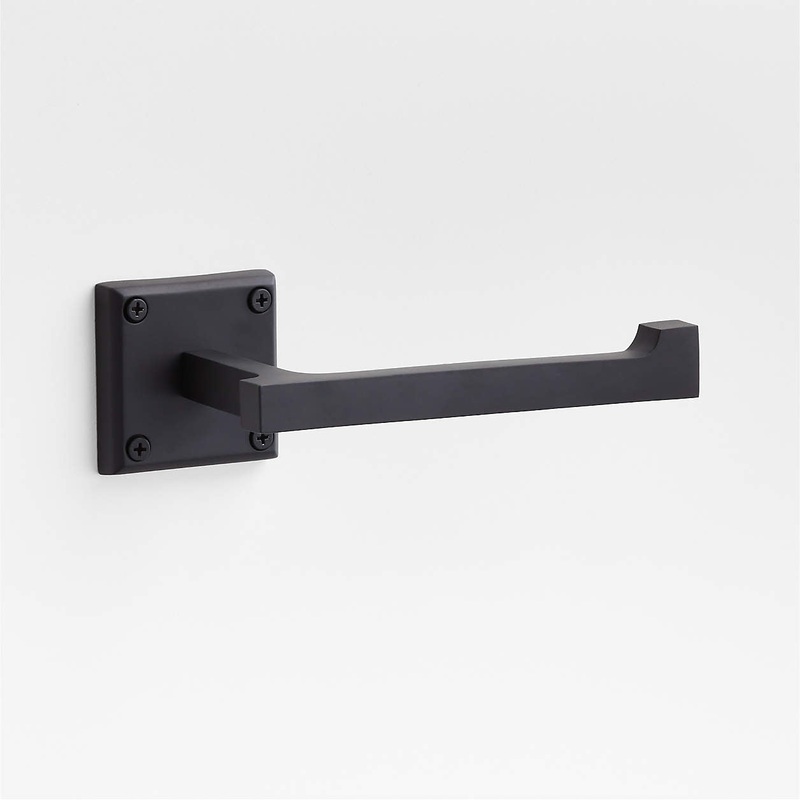 Sometimes it’s the small things that pull a room together. That’s why we’ve designed a hardware collection with modern silhouettes, clean lines and a touch of tradition to give your bathroom that perfect finishing touch. Rounded corners and smoothed edges soften the minimalist design of the toilet paper holder made of matte black-finished brass. The open-ended design makes it easy to load a roll of toilet paper, and the mix of square and rectangular shapes gives the holder a geo-forward look that’s bold and contemporary. The fixture is ready to mount on the wall with included hardware.Square Edge Matte Black Wall-Mounted Toilet Paper Holder 6.9″Wx3.5″Dx2.5″HBrass with matte black finishInstallation hardware includedBathroom-safeWipe clean with soft clothMade in India
