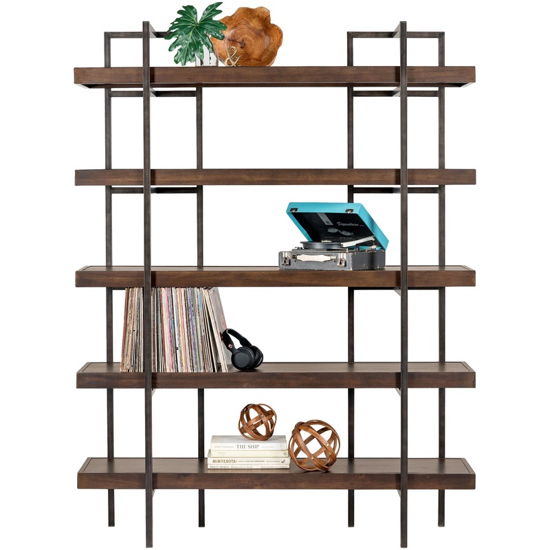The Starmore walnut bookcase has a hint of mid-century influence, but its sleek lines and oiled walnut-tone finish give it modern, industrial overtones. This set of shelves is built around a tubular metal frame, nicely blackened to complement the oiled woo
