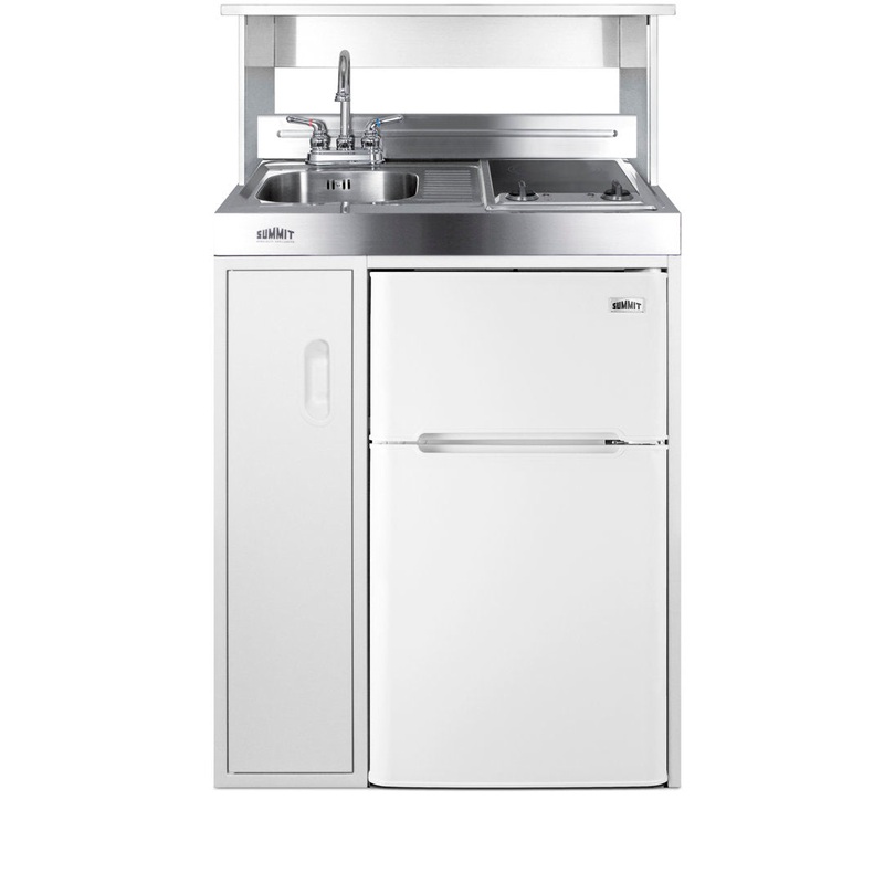 Complete all-in-one convenience with a refrigerator-freezer, cooktop, sink, and storage compartment Summit Appliance