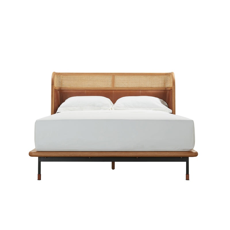 - Rattan headboard upholstered in genuine saddle nut leather.