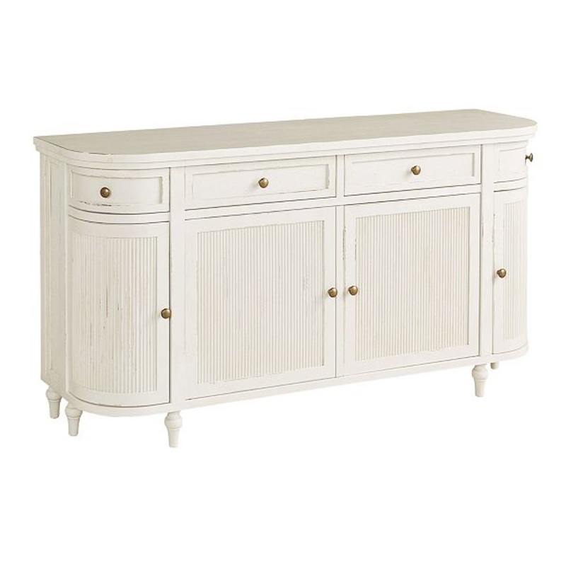 Inspired by a Swedish Gustavian antique, our Tilde Curved Sideboard Cabinet is rich in period details. The elegant silhouette is beautifully crafted with carved fluted doors and quarter drawers that flow around the corners in graceful curves, making the sides just as beautiful as the faade. A wide adjustable shelf behind the center doors, plus one at each corner, offer generous hidden storage for dishware and serving pieces. Four paneled drawers hold silverware, table linens and utensils.Tilde Sideboard features:Crafted of hardwoodFluted drawer frontsRecessed frame moldingTurned bulb feetThree adjustable shelvesAntique brass finish pullsWood drawer glidesLevelers for perfect alignmentFully assembled