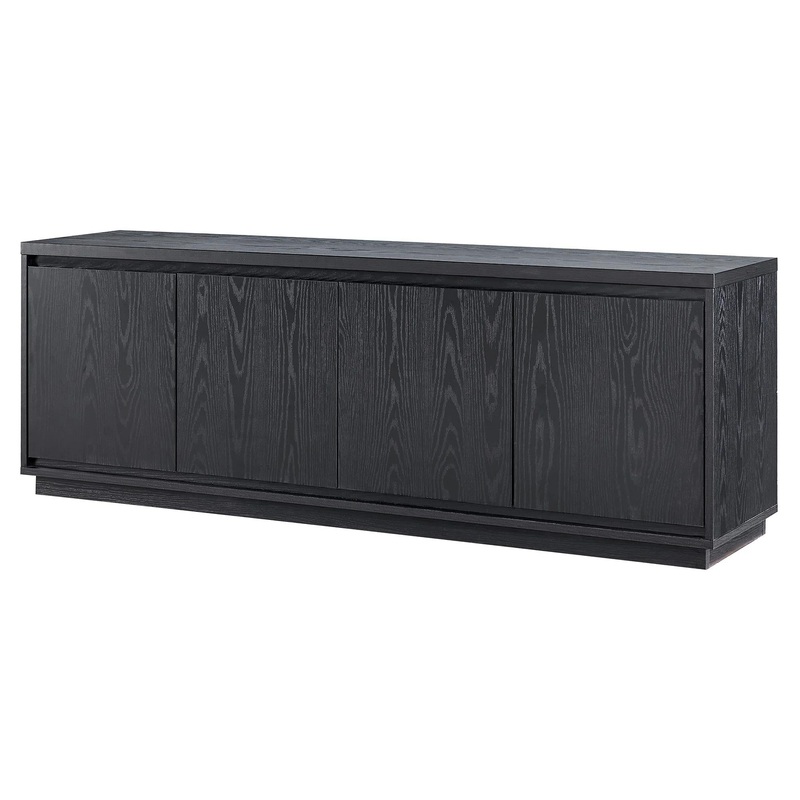 Combine functionality and eclectic modern design with this contemporaray TV stand. Its rich wood tone creates a warm neutral palette that will blend seamlessly into any color scheme, while its classic styling pairs perfectly with the existing design inspiration of your living room, den, or game room. This solid-backed stand features two large enclosed cabinets with a 3-way inward beveled edge, adding dimensionality. Cable management cut-outs and adjustable inner shelves help keep your media storage and consoles organized.FeaturesA modern contemporary design accommodates TVs up to 80″ for your entertaining space.Constructed of sturdy MDF materials in a handcrafted black grain finish.Features four beveled doors with enclosed cabinets and 4 shelves for ample storage.The top has a weight capacity of 75lbs. Lower shelves can hold 25lbs. each.Clean with a soft, dry cloth; no harsh chemicals or abrasive cleaning materials.Features easy assembly.