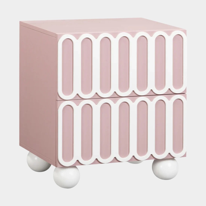 Say goodbye to a boring bedtime routine with the Tori Motif Nightstand, available in dreamy mauve or blue and sophisticated taupe, each featuring a statement-making facade that truly pops. Its solid wood, spherical legs infuse a sculptural Hollywood buzz, while the medium sheen on the surfaces delivers just the right amount of drama without fussy maintenance. Plus, the nightstand’s drawers glide smoothly on soft-close rails, ensuring you keep the morning peace, not waking your partner as you start your day.