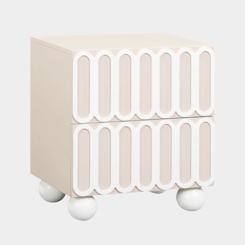 Description:Say goodbye to a boring bedtime routine with the Tori Motif Nightstand, available in dreamy mauve or blue and sophisticated taupe, each featuring a statement-making facade that truly pops. Its solid wood, spherical legs infuse a sculptural Holl