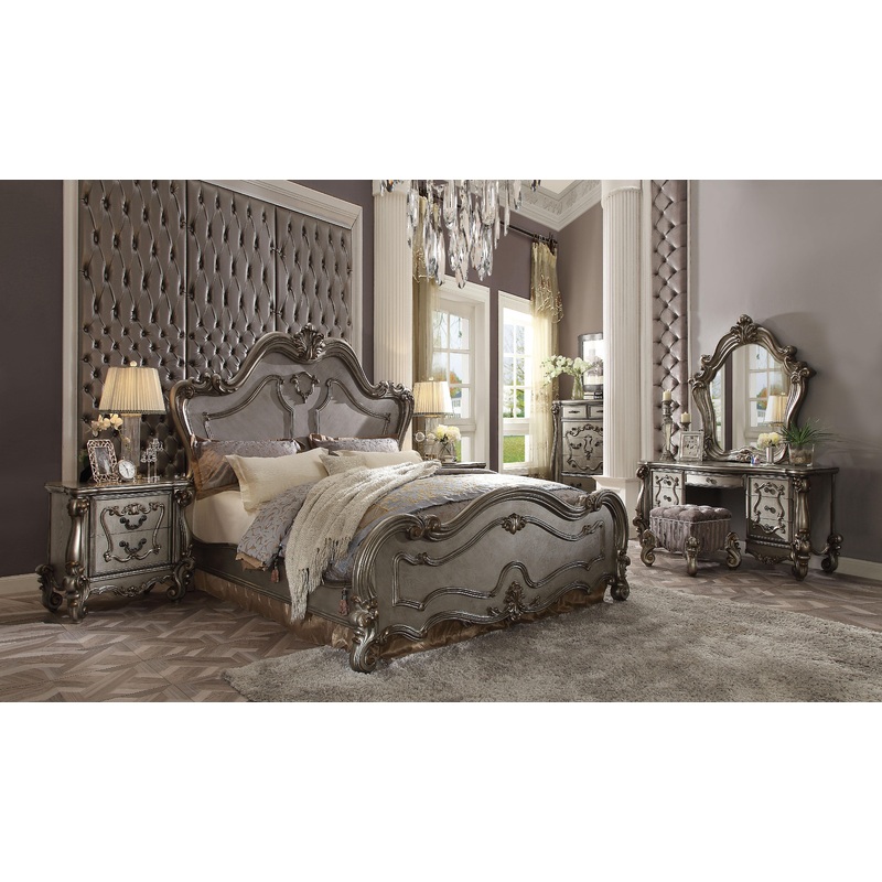 ACME Versailles Queen Bed, Antique Platinum (1Set/3Ctn), 93" x 74" x 72"H, 254lbs. Sleeping like royalty with this Versailles collection, the bedroom set was inspired by old European design. This collection features carved scrollwork accent on headboard. T